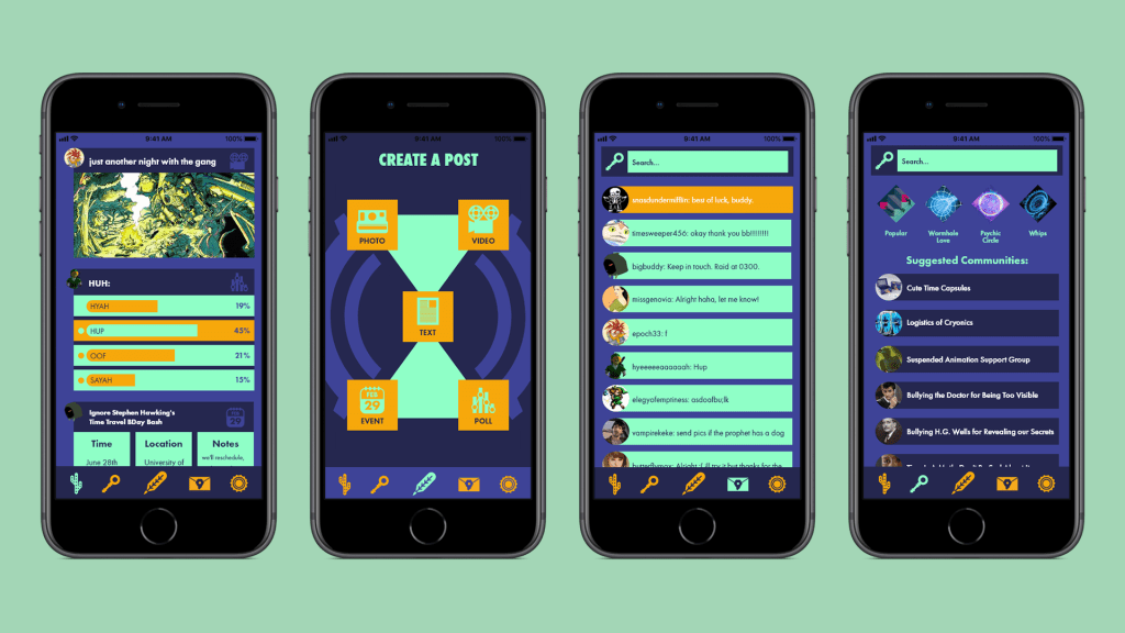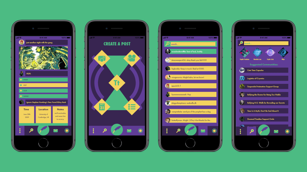 With the sole prompt of making an app about time, I decided to make a half-parody-half-real-prototype of a social network specifically for time travelers. This project made me look hard at popular social networks like Facebook, Tumblr, and Reddit to see why their design worked for their users. From that research, I determined that they could be implemented in a similar but ultimately unique way for a narrow audience.