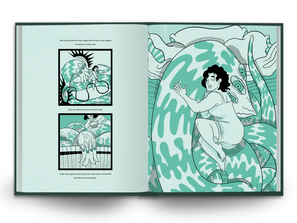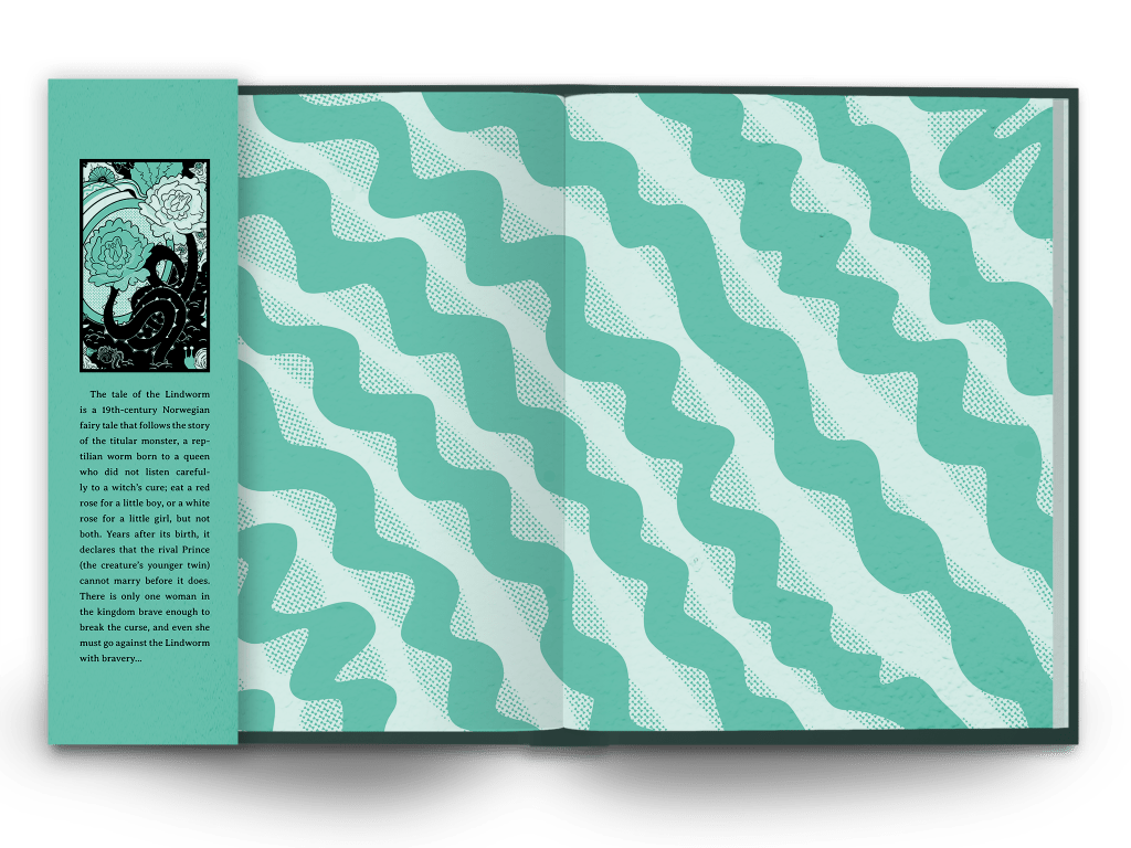 My first full-scale publishing project, The Lindworm, is an illustrated Norwegian fairy tale. The story follows a queen ignoring the directions of a wise old witch, leading to a reign of terror by her first born — a terrible, worm-like dragon. I first read this tale thanks to an adaptation by the talented Michelle Krivanek, Bride of the Rose Beast. I was particularly inspired by her decision to reframe the story under a sapphic lense; the Lindworm, originally a Prince, was transformed into a Princess.