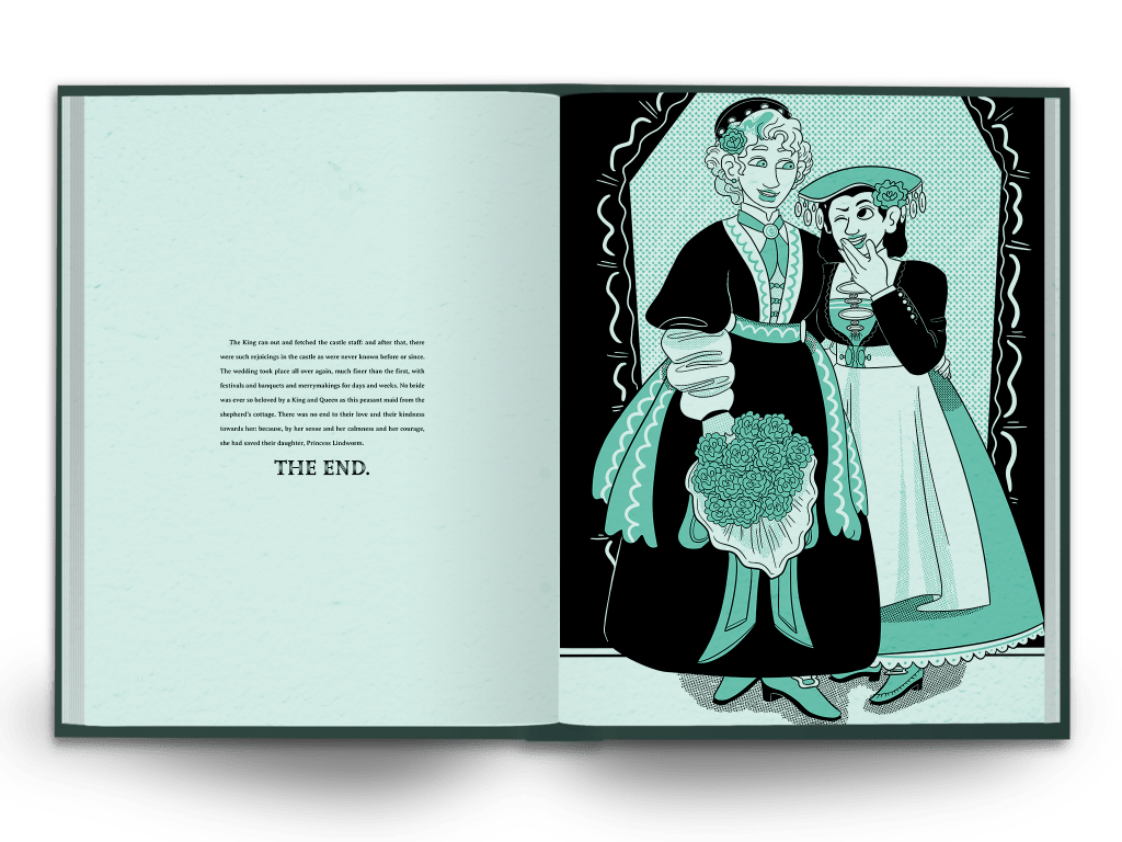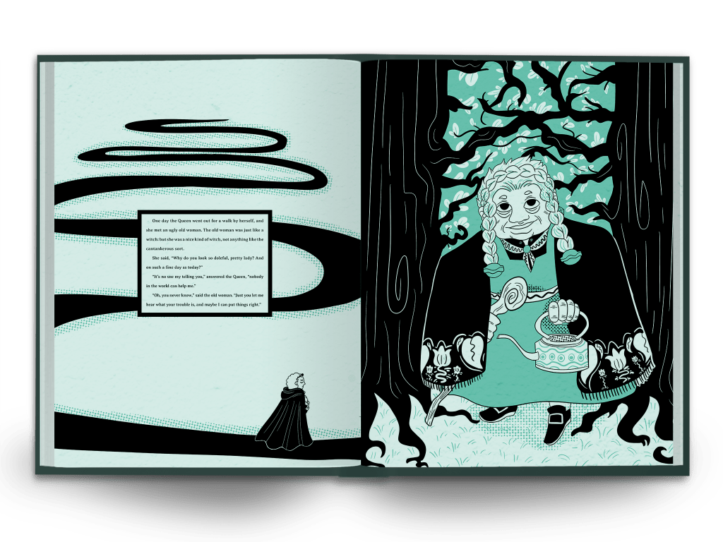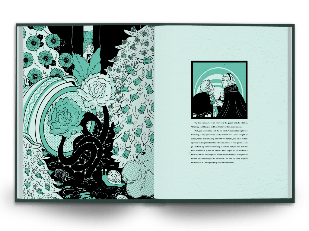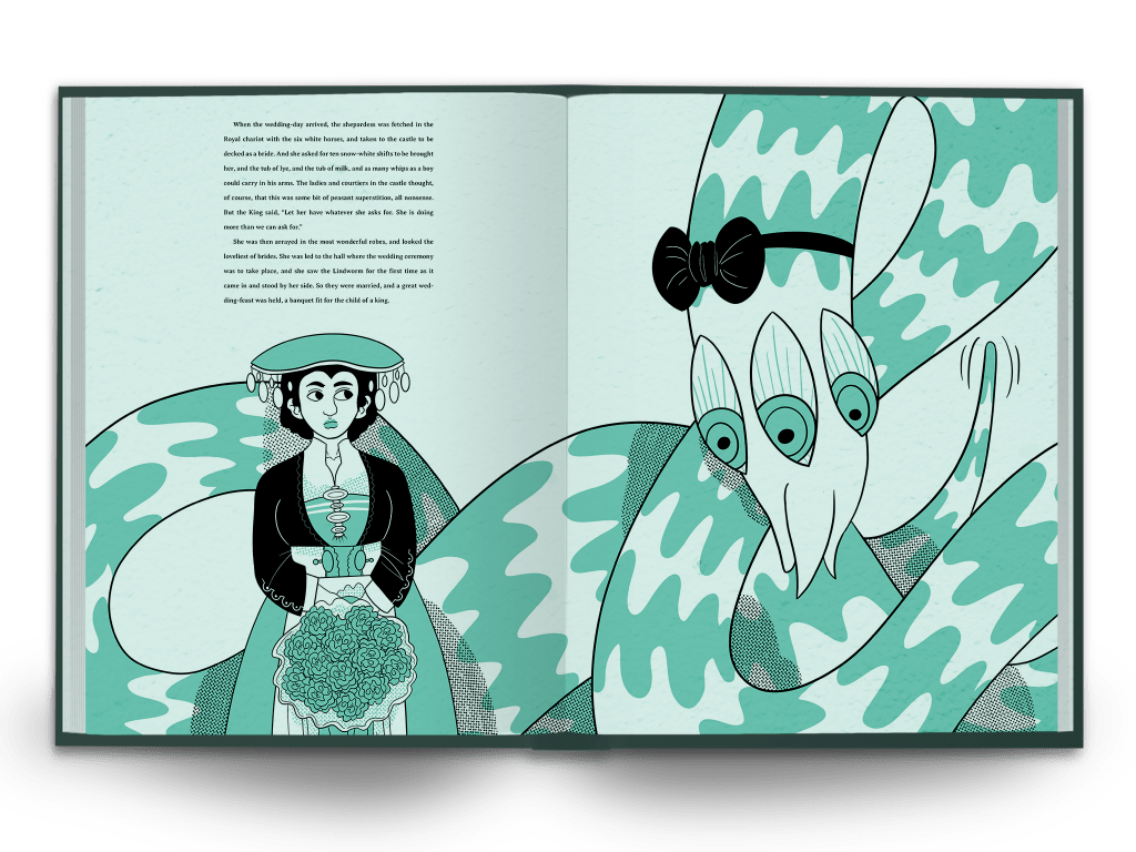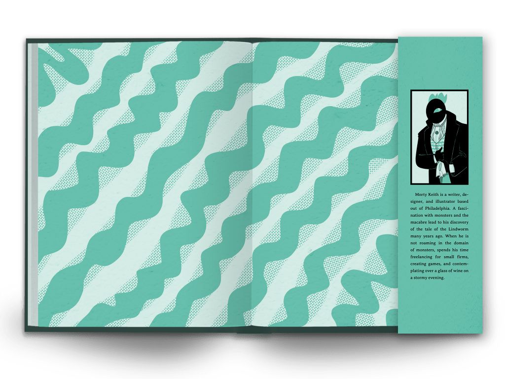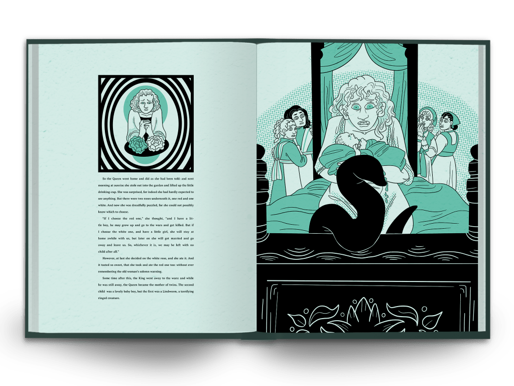 Throughout the design process, I sought to challenge myself to illustrate in ways I previously felt were uncomfortable. I have illustrated for a number of years, but have feared complicated compositions with landscapes, interiors, and complicated monsters; to overcome this fear, I included all of those in The Lindworm. My color palette only contained three colors; white, black, and teal. Other fairy tale books focus on a naturalistic, painterly method to depict their stories, and I went the opposite direction to capture the mood of such a tense and dark story. In an effort to move away from my tendencies to illustrate for comics, I made fully formed illustrations that spoke for themselves out of sequence. Thirty-two compositions later, and I surpassed my vision.