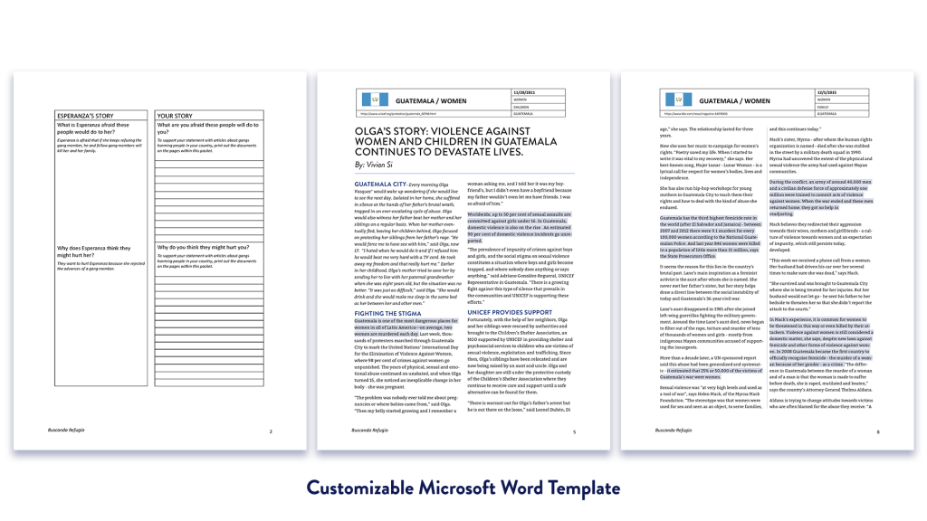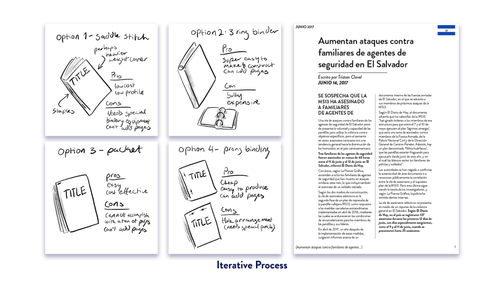 The interface, subgroups and design needs that faced us presented our team with a unique set of challenges. For this draft exhibition copy, we decided to focus on the Women from Guatemala Subgroup. We decided that for the purposes of the upcoming exhibition, we would create two versions of the packet; a high fidelity version printed on high quality paper stock, prong bound with perforated pages, and a low fidelity Microsoft Word template to be printed on copy paper.