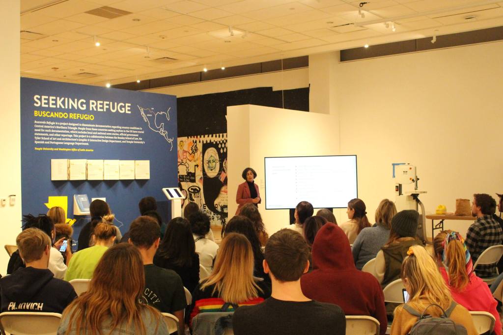 Finally, with all the hard work done on the packets, the teams convened at an opening event for the exhibition on November 11th, 2019. All the students from Professors Ramji-Nogales and Satalino’s classes attended, as well as a number of Tyler students, faculty, and staff. Professor Ramji-Nogales opened up the event by describing the events that led to the foundation of the project, followed by Professor Satalino describing the bricks and mortar of the design portion. After, all the team leaders had a chance to present their teams’ work.
