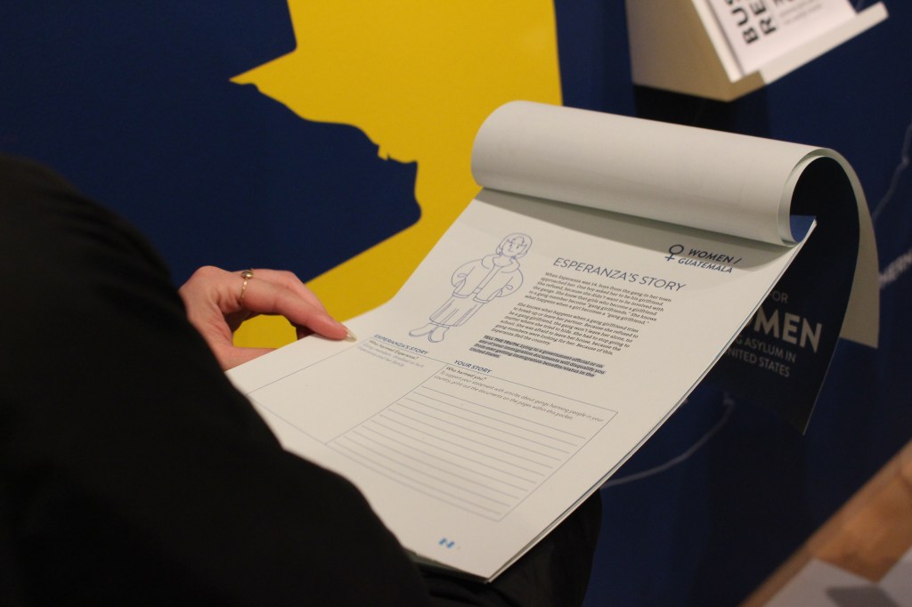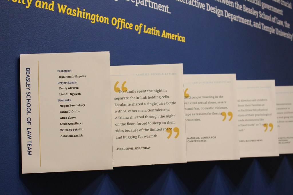Each team in this project had equally demanding and important tasks to complete. The Beasley Law team, representing WOLA and led by Professor Jaya Ramji-Nogales, performed the majority of the Pro Se research. They collected materials for the Tyler teams to utilize in their designs. These included articles detailing violence and strife, statistics, or general user stories of mistreatment in each respective country that the end user could compare to their own situation. Temple’s Spanish and Portuguese language departments did the vital work of translating all the Pro Se materials to their respective languages. This allowed our group of end users to use them best. Finally, the Senior Design Workshop, led by Professor Bryan Satalino of Tyler School of Art and Architecture’s Graphic and Interactive Design program, prepared and designed the Pro Se materials for use in a paper packet, a mobile app, and a walk-in exhibition at Temple Contemporary.